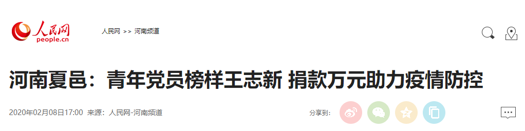 人民网:青年党员榜样王志新 捐款万元助力疫情防控